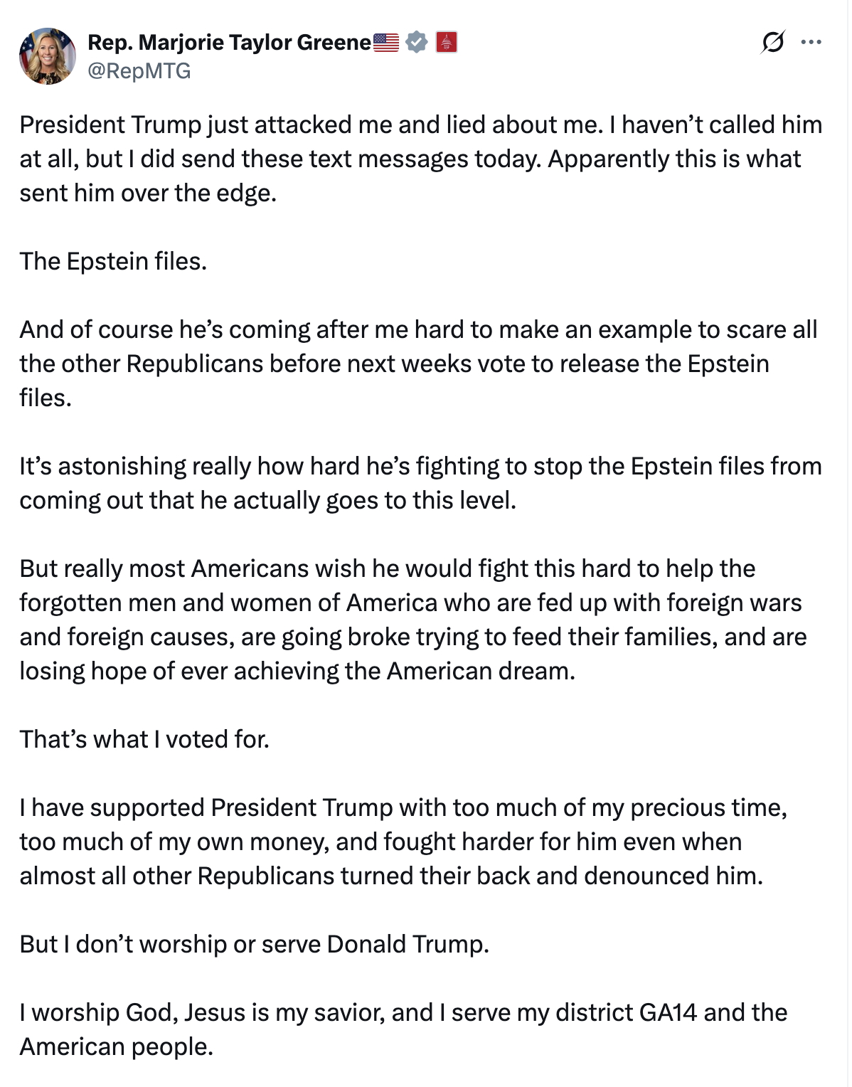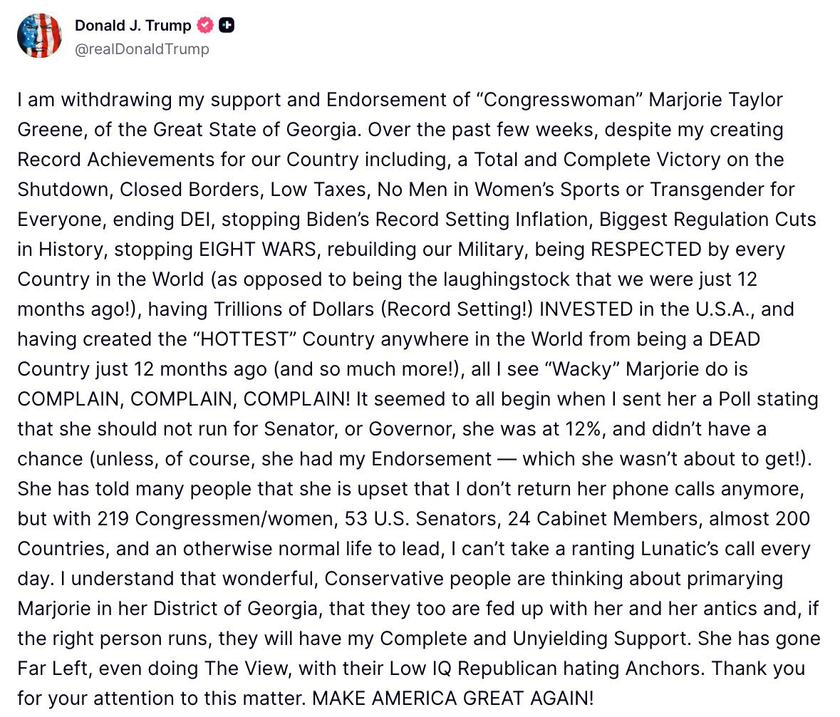 Bill Clinton Cocksucker Donald Trump Turns On "Lunatic" Marjorie Taylor Greene Over Demand For Epstein Files