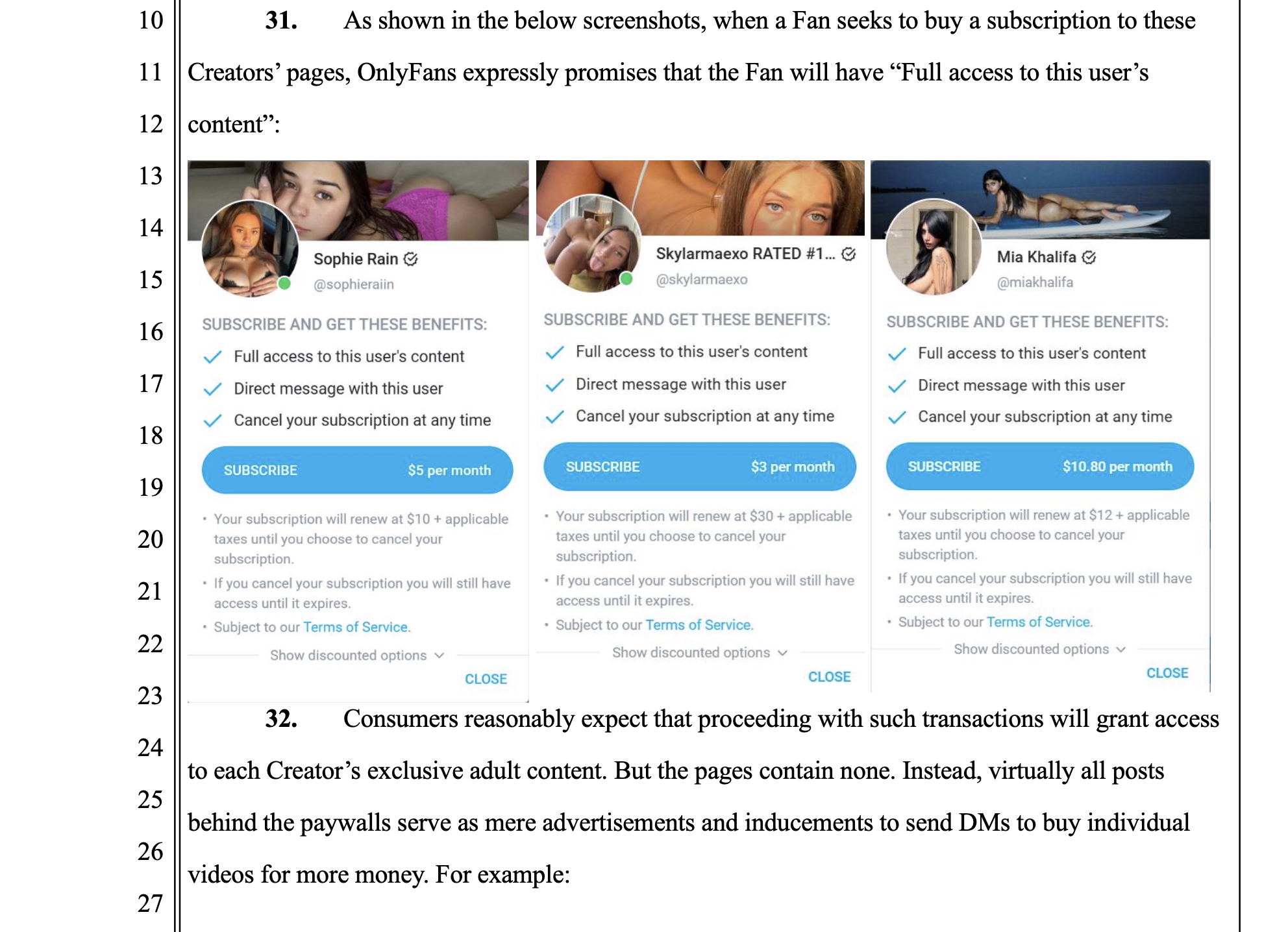 OnlyFans is the dominant global platform for performer-specific pornographic content. OnlyFans enlists individual performers to create content (“Creators”), and then sells access to that content to individual consumers (“Fans”). It boasts over 400 million Fans, and generates more than $7 billion in annual revenue. In exchange for monthly fees, Fans can buy subscriptions to Creators, which permits them to message with that Creator and obtain full access to that Creator’s content. The latter representation is explicit: when any Fan attempts to buy a subscription to any Creator, OnlyFans expressly promises that the payment will provide “Full access to this user’s content.” But millions of Fans have bought subscriptions only to discover that, behind OnlyFans’s paywalls, Creators’ exclusive content remains inaccessible. That is because numerous Creators—including many of the most prominent Creators on the platform—systematically refrain from posting any exclusive content. Instead, with OnlyFans’s facilitation, encouragement, and knowledge, Creators solely post “teasers” of exclusive content, and instead bombard Fans with automated “direct messages” soliciting purchases of their content for more money. Thus, the sole “benefit” of many subscriptions is the privilege of being spammed with offers to buy access to content that OnlyFans initially promised. In essence, OnlyFans promises a buffet, but provides only a menu. OnlyFans is responsible for this systemic bait-and-switch, which contradicts its core subscription promise to consumers.