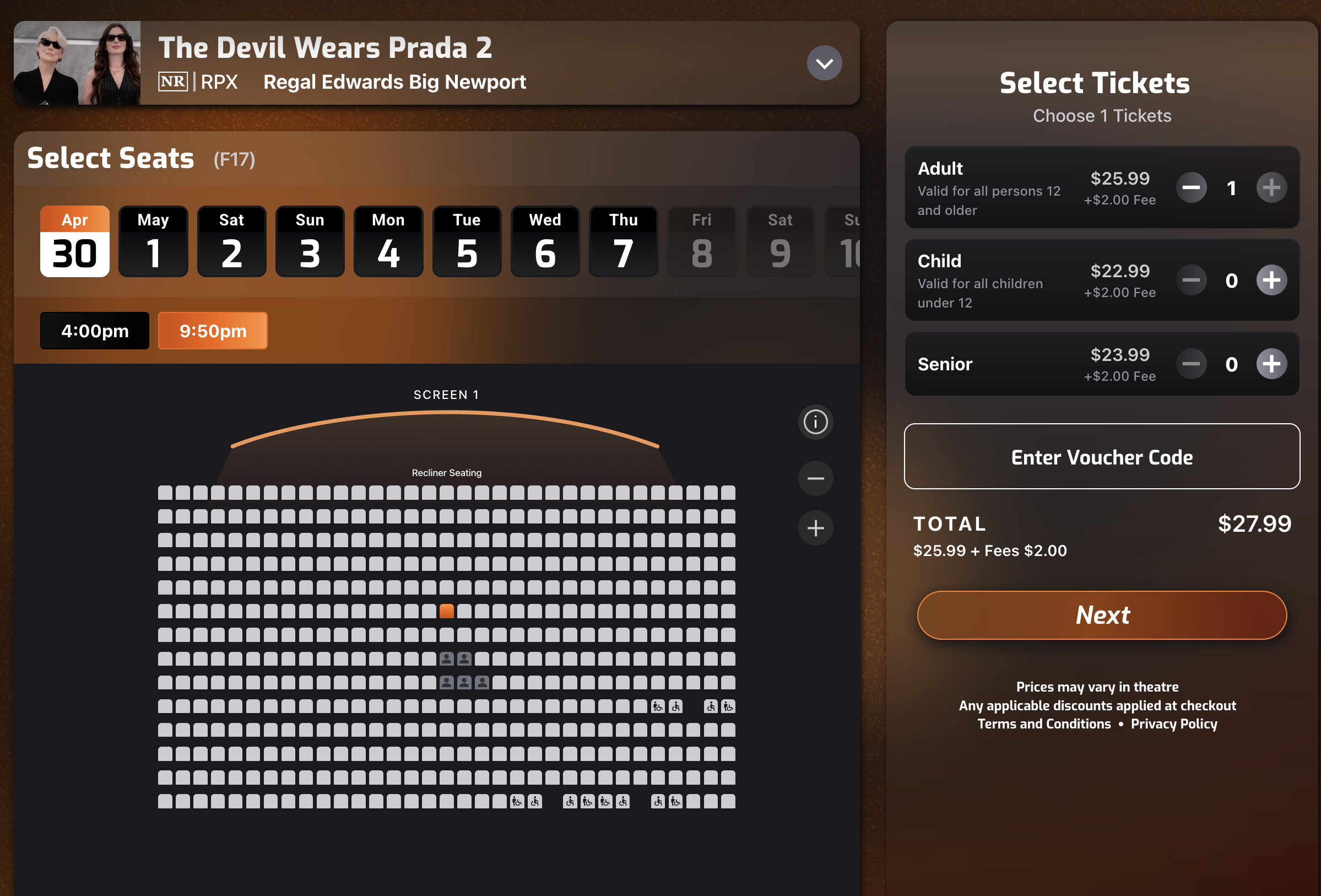 If you’re a pig like me and want a soda (Diet Cherry Coke), popcorn (extra butter and salt), and candy (Sour Patch Kids), you’re looking at spending $70 for a shitty movie that’ll be free on one of the streaming sites in two months. Side note: There have only been five tickets sold for tomorrow night’s premiere at the best movie theater in Orange County, which has the largest screen in California. Yikes.