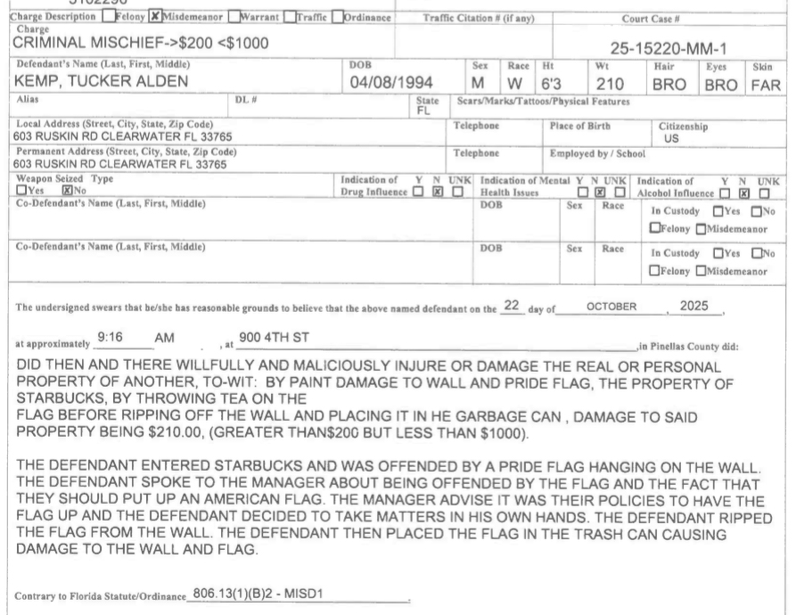 Tucker Kemp, 31, was arrested yesterday for criminal mischief in connection with the incident at a Starbucks in Florida. Investigators say Kemp entered the Starbucks around 9:15 AM and spoke to a manager “about being offended by the flag and the fact that they should put up an American flag.” After the worker explained that it “was their policies” to display the Pride flag, Kemp allegedly “decided to take matters in his own hand,” according to an arrest affidavit. Kemp, cops charge, doused the flag in tea and then “ripped the flag from the wall” and put it in the trash. Cops estimated that Kemp caused about $210 in damages to the wall and the flag.