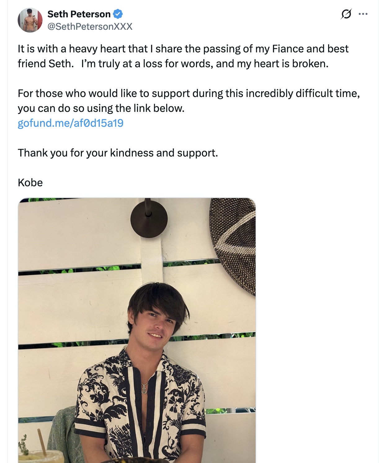 In the tweet (see below), Peterson’s boyfriend wrote, “It is with a heavy heart that I share the passing of my fiancé and best friend Seth. I’m truly at a loss for words, and my heart is broken. For those who would like to support during this incredibly difficult time, you can do so using the link below.”