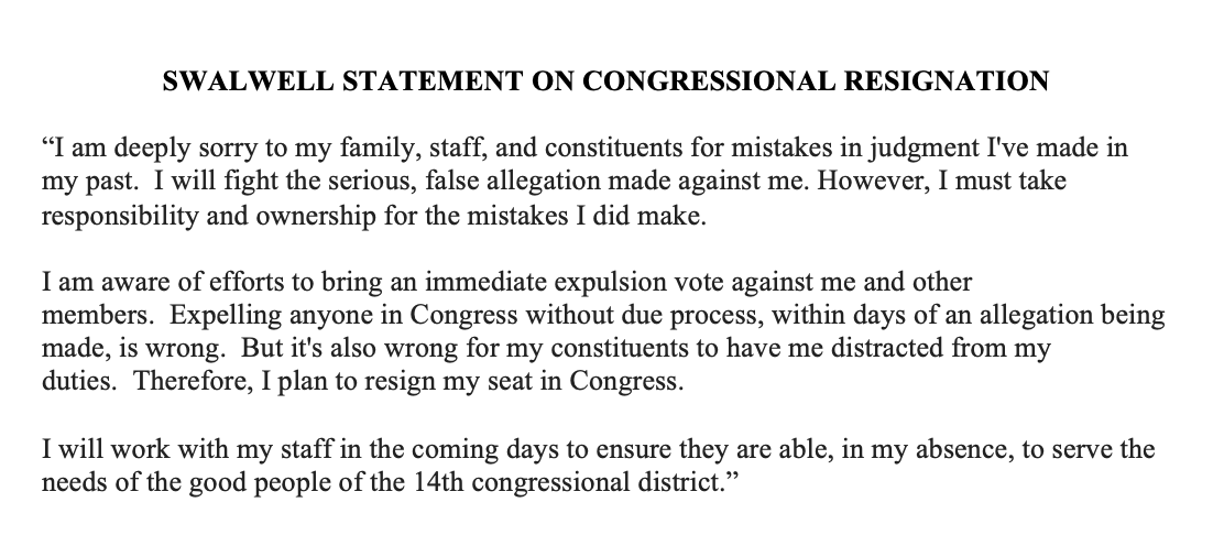 That was fast! He ended his campaign for governor yesterday, and less than 24 hours later, Eric Swalwell just announced that he’s quitting congress, too. His statement just posted: