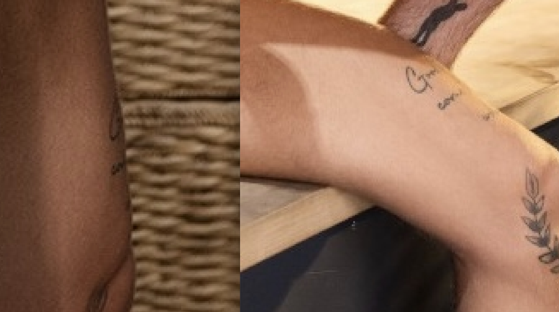 Just above the knee, you can see a little bit of text, and then right on the knee cap, you can see the beginning of one of those laurel wreath tattoos.
