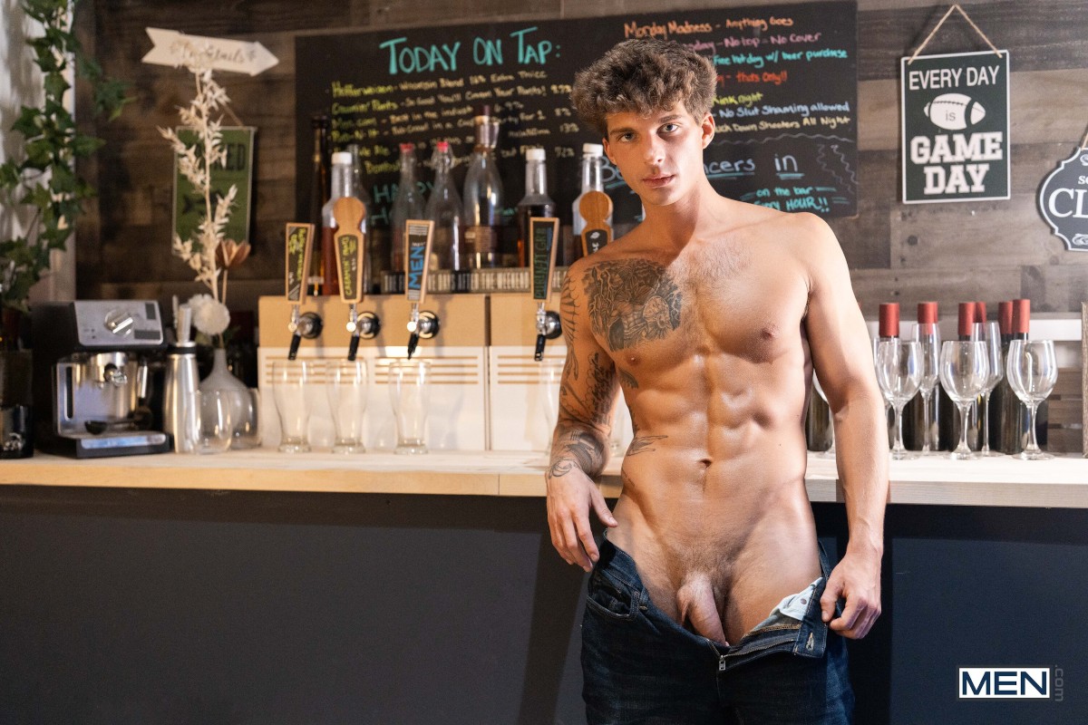 Do you want the good news or the bad news first? How about getting the bad news out of the way first, since this scene is still pretty good. The bad news: Despite this scene’s title, “Breeding The Bartender,” gay porn newcomer Leo Levine does not breed Joey Mills. Instead, Leo Levine blows his load at the very beginning of the scene while he’s jerking off at Joey’s bar, as seen here: