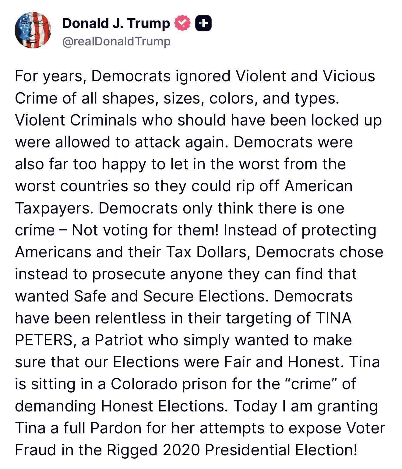The dementia has really kicked into high gear lately, but what’s even more embarrassing is that no one on the Pedo-in-Chief’s staff and no one in his inner circle bothered to tell him that he can’t pardon someone convicted on state charges. In this case, that state was Colorado, and the looney-tunes whore who’s rotting in prison for nine years is Tina Peters. Pedo’s post about his worthless “pardon”: