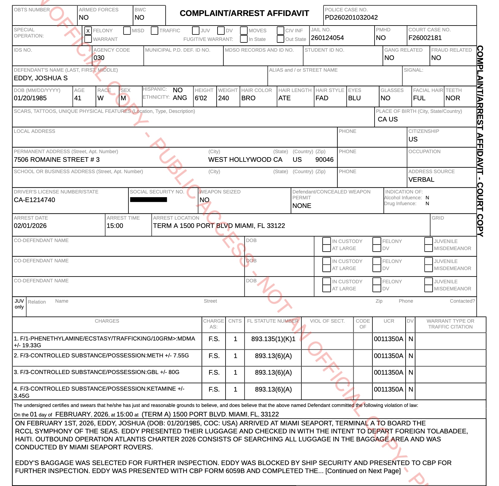 On Sunday, at PortMiami’s Terminal A on Dodge Island, trained dogs screened luggage during the boarding of the Symphony of the Seas, a cruise ship with a capacity for over 5,500 passengers, records show. In the luggage belonging to Joshua Eddy, 41, of West Hollywood, Calif., CBP officers reported finding “several bags” with pills and a liquid that tested positive for 19.3 grams of MDMA, 3.4 grams of ketamine, 7.55 grams of meth, and 80 grams of GBL. Court records showed Eddy appeared in bond court on Monday, and he faced four charges: Trafficking MDMA and three counts of possession of a controlled substance. His bond was set at $7,000.